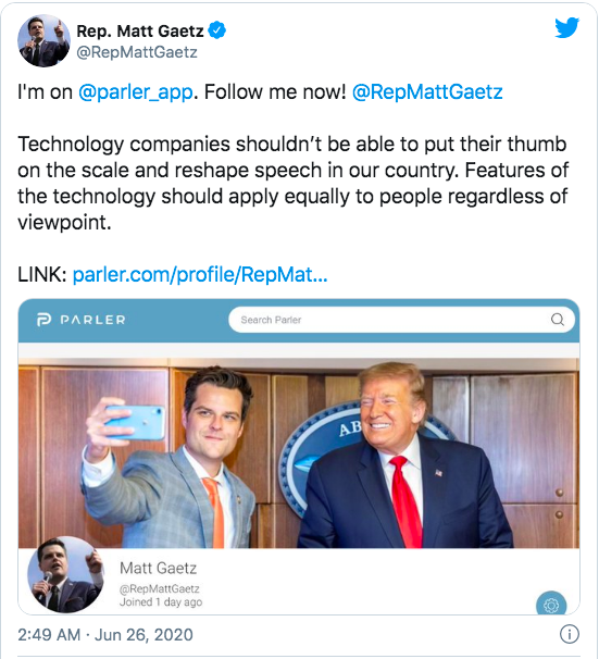 “The left wants to defund the actual police,” Gaetz said in his first post on Parler. “I would just like to defund the thought police in Silicon Valley.”