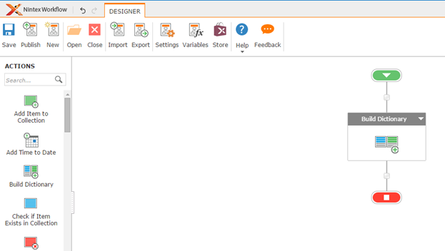 Add the action, “Build Dictionary” either by right click on the workflow or by dragging and dropping from the left toolbox.