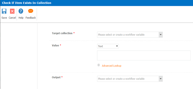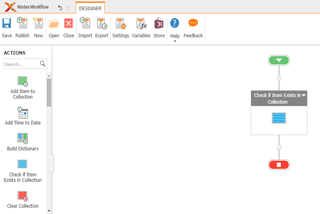 Add the action, “Check if Item Exists in Collection” either by right click on the workflow or by dragging and dropping from the left toolbox.