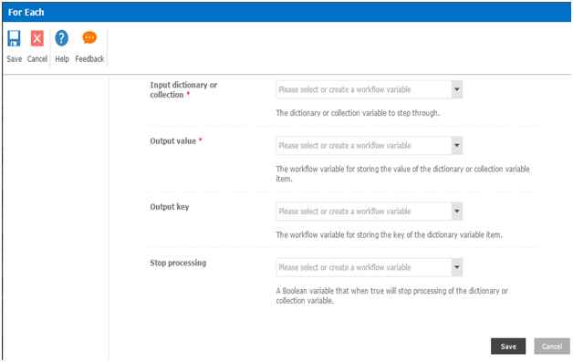 Add the action, “For Each” either by right clicks on the workflow or by dragging and dropping from the left toolbox.