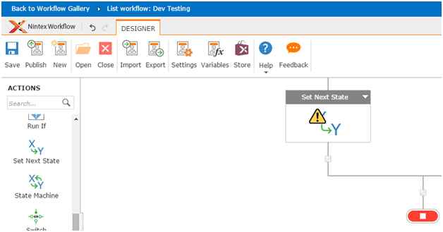 Add the action, “Set Next State” either by right clicks on the workflow or by dragging and dropping from the left toolbox.