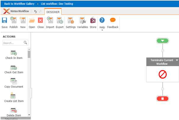 Using this action you can terminate a running instance of workflow. Let’s see the implementation of this functionality.
