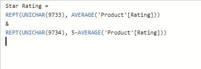 Now, I want to show a rating out of five. So, one star will be unfilled. So, I have used the following: REPT(UNICHAR(9734), 5-AVERAGE('Product'[Rating]))