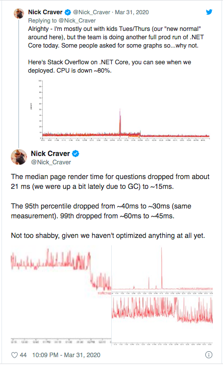Our friends at Stack Overflow do a great job of sharing data on their service. One of their engineers, Nick Craver, recently shared improvements they saw to latency, as a result of moving to .NET Core: