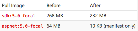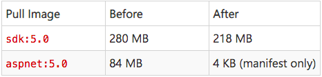 We are always looking for opportunities to make .NET container images smaller and easier to use. We made a change in Preview 4 that dramatically reduces the size of the aggregate images you pull in multi-stage-build scenarios (which is a very common pattern). We re-based the SDK image on top of the ASP.NET image instead of buildpack-deps.