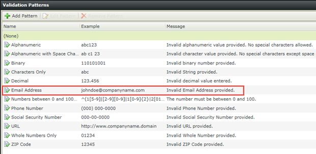 Validation Patterns are regular expressions used to enforce validation on a certain control when data is captured. There are several default validation types available. Additional validation patterns can be configured and the validation error message can be customized.