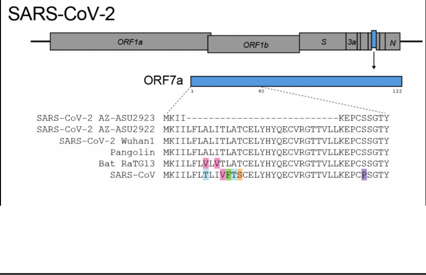 A genome deletion was found that removes 27 protein building blocks, called amino acids, from the SARS-CoV-2 accessory protein ORF7a. The protein is very similar to the 2003 SARS-CoV immune antagonist ORF7a/X4. This sequence alignment shows the gap when compared to other coronavirus samples.
