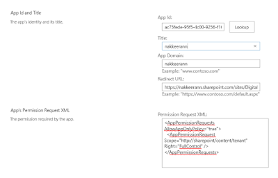 The app permissions can be created from this request page (https://nakkeerann.sharepoint.com/_layouts/15/appregnew.aspx). Copy the client ID and client secret once generated for later use.