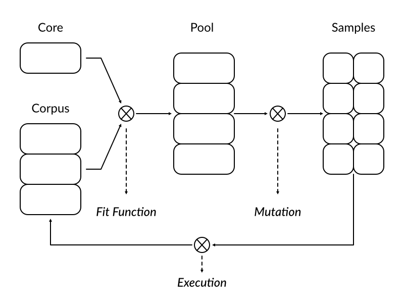 On the picture above we see a simplified diagram of our new mutation strategy. Typical round begins with fit function deciding which samples from core set and corpus are best suited to be promoted to a mutation pool. Chosen samples are then mutated forming a new body of samples to be fed to execution engine. After the target program finishes processing individual sample it is placed back in the corpus together with a trace information. When all mutated samples from a given round are processed a new round begins.