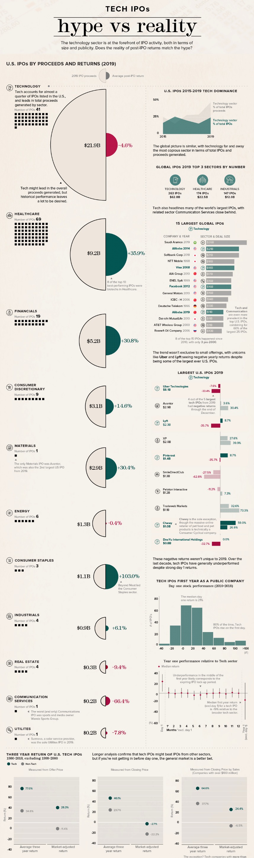 The prevalence of tech is even more apparent when examining history’s largest IPOs. Of the 25 largest IPOs in U.S. history, 60% come from the technology and communication services sectors.