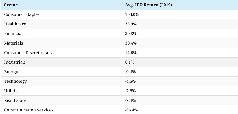 And they were far from isolated incidents. Tech IPOs averaged a return of -4.6% last year, far behind the top sectors of consumer staples (led by Beyond Meat) and healthcare.