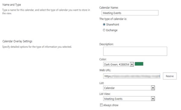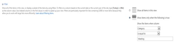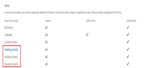 Click on Create view under Views section. Choose Calendar View as view type. Enter “Meeting Events” as view name. Set the filter for the view and then click on Ok button.