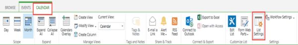 We will create separate view for each category. Navigate to the Calendar list and then click on List Settings which is available under Calendar tab in the ribbon interface.