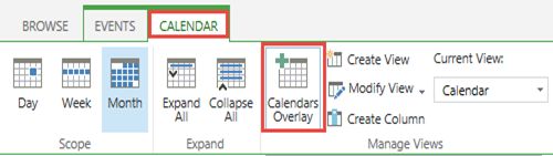 Navigate to the Calendar list and then click on Calendars Overlay which is available under Calendar tab in the ribbon interface.