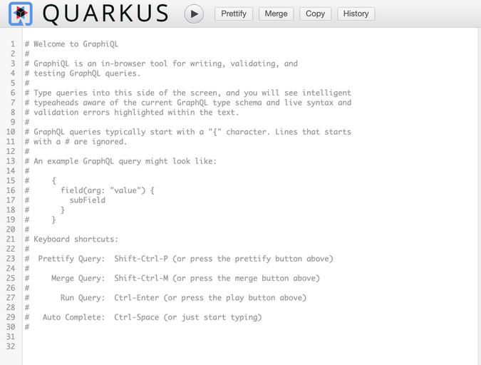Once the Quarkus runtime starts, access GraphiQL's UI locally using http://localhost:8080/graphql-ui/. You will see:
