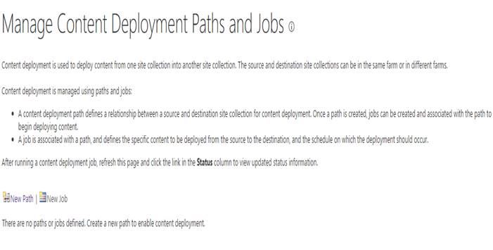 Click on New Path The path defines a relationship between a source and destination site collection for content deployment. A job is associated with the path, once path is created, you will be able to create a new job.