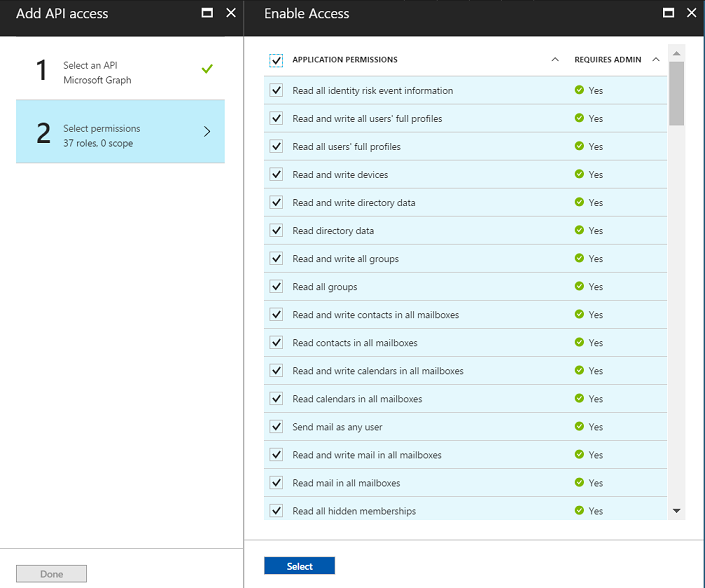 Select the necessary permissions. The following snapshot shows the permissions selected for the application. Click on Select >> Done.