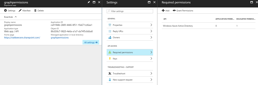 Then, you need to add the source data APIs for providing permissions. From the app registered, select the settings -> Required Permissions.