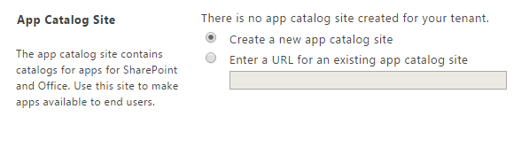 As we currently don’t have an App Catalog Site, it will ask us to create one.
