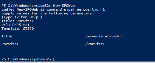 New-SPOWeb -Title "PnPSite1" -Description "PnPDescription1" -Url "PnPSite1" -Template "STS#0"