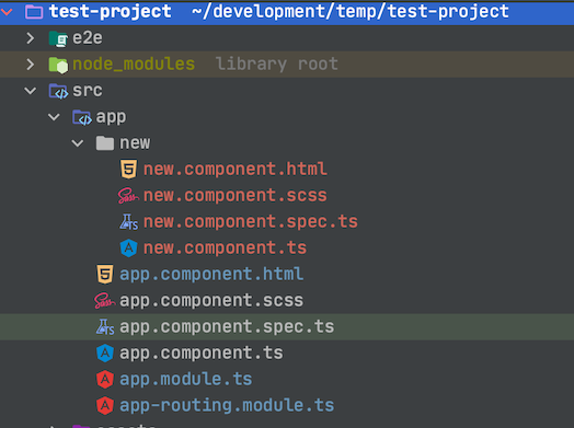 Our new component should now be found at src/app/<new component name>. So lets say our new component name was new, we would find our new component at src/app/new as shown below.