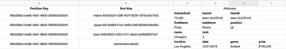 We’ll need to partition each of our tournaments based on a unique but uniformly distributed identifier. For this, I would recommend using UUIDv4 to generate unique tournament ids. So let’s take a look at what this could look like in a DynamoDB Table. Our UUIDv4 tournament id acts as our partition key.
