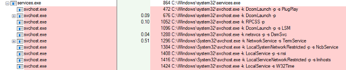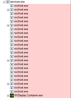 All those services and others will be spawned as children of the “services.exe” process and when looking at the “services.exe” process we’ll see two kinds of processes.