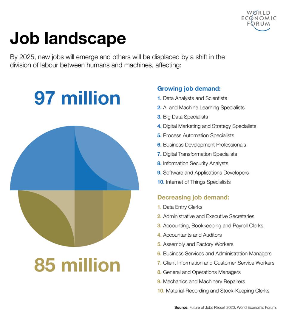 In its “Future of Jobs Report 2020,” the World Economic Forum estimates that 85 million jobs will be displaced while 97 million new jobs will be created across 26 countries by 2025.
