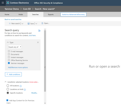 Once in Native Mode, all messages and files posted in your Yammer network will be available through the same eDiscovery tools you use to manage your data throughout the rest of the Office 365 suite. Within the eDiscovery module of the Security and Compliance Center you can search by user and retrieve their Yammer messages alongside other messages they have sent through Outlook, Teams, and other Microsoft applications. You can filter down to retrieve Yammer messages based on the author of the message, the recipient of the message, or the community the message was posted in.