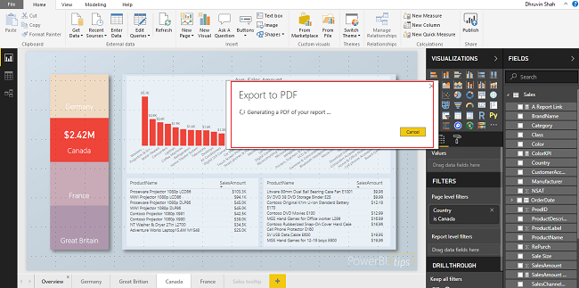 This is how the "Export to PDF" option works for Power BI Desktop.