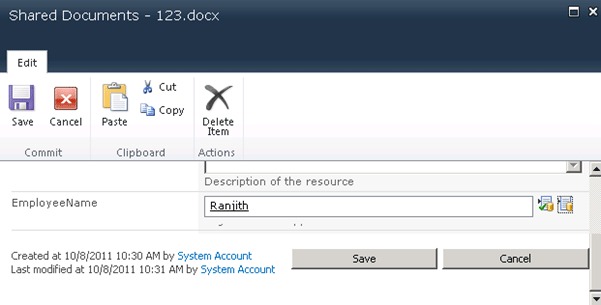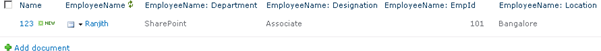 I have a document library called Shared Documents in my SharePoint site. I have added an External Data column named Employee Name which includes some additional fields Designation, Location, EmpId and Department. I am going to add these external data column into the word document so that the values will be automatically populated based on the external data columns in the word document.