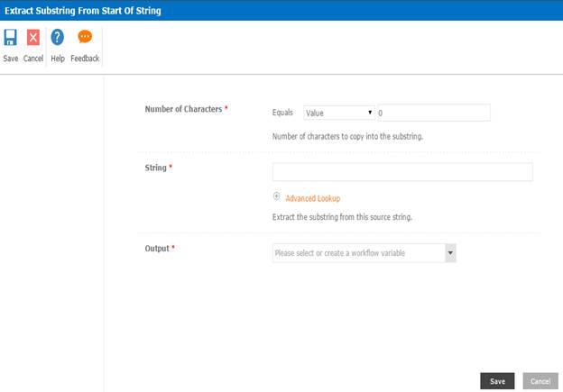 Add the action, “Extract Substring from Start of String” either by right click on the workflow or by dragging and dropping from the left toolbox.