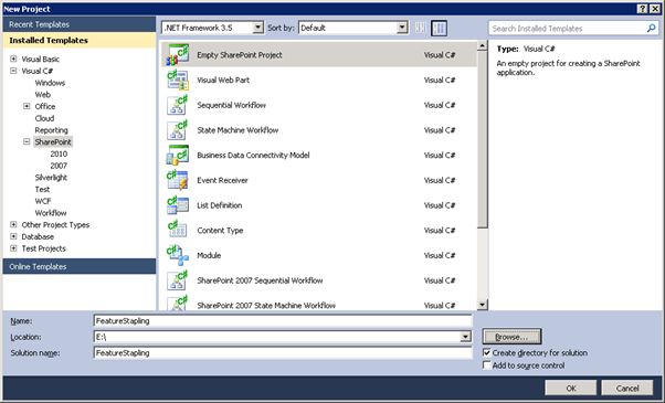 In the New Project dialog box, expand the Visual C# node, and then select the SharePoint 2010 node.