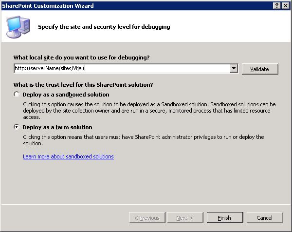 Enter the local site URL for debugging, select "Deploy as a farm solution" as in the following and then click on "Finish".