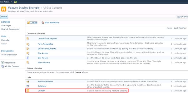 In this section you will see how to create a new feature and feature receiver to create a custom list in the site.