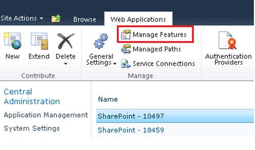 Select the web application and then click on "Manage Features" in the ribbon interface.