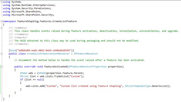 Double-click on CreateListFeature.EventReceiver.cs and replace the code with the following: