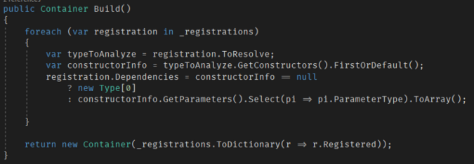 The first task of the ContainerBuilder is to keep track of all the registrations. Next, implement the Build method, which will hand down the registrations to a Container object and return it.