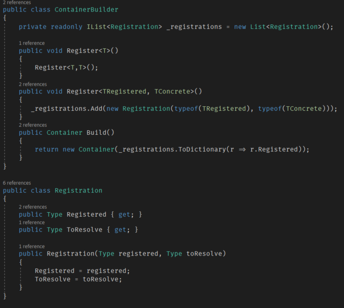 Rather than keeping a list of types, let’s create an object Registration which will allow me to track all the relevant metadata for my container.