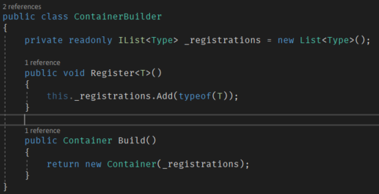Like any DI framework, I will need a ContainerBuilder to keep track of all the types I would want to instantiate.