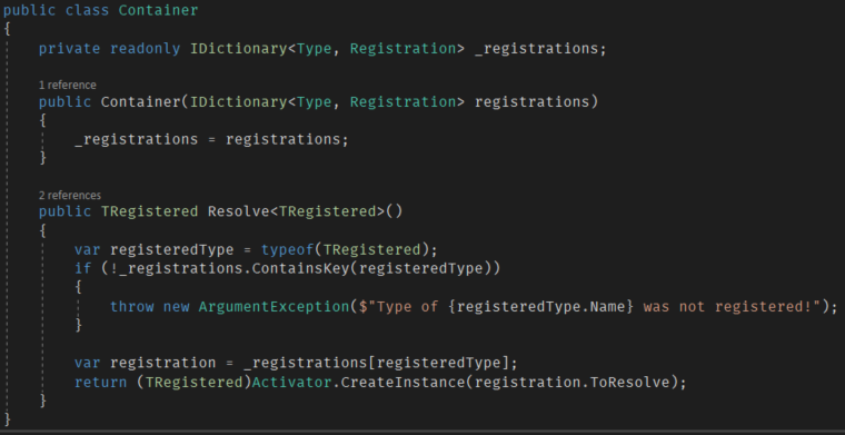 In my Resolve method, I need to lookup the registration first. Now you can already start seeing the benefits of the method, where before it was just a wrapper around Activator .