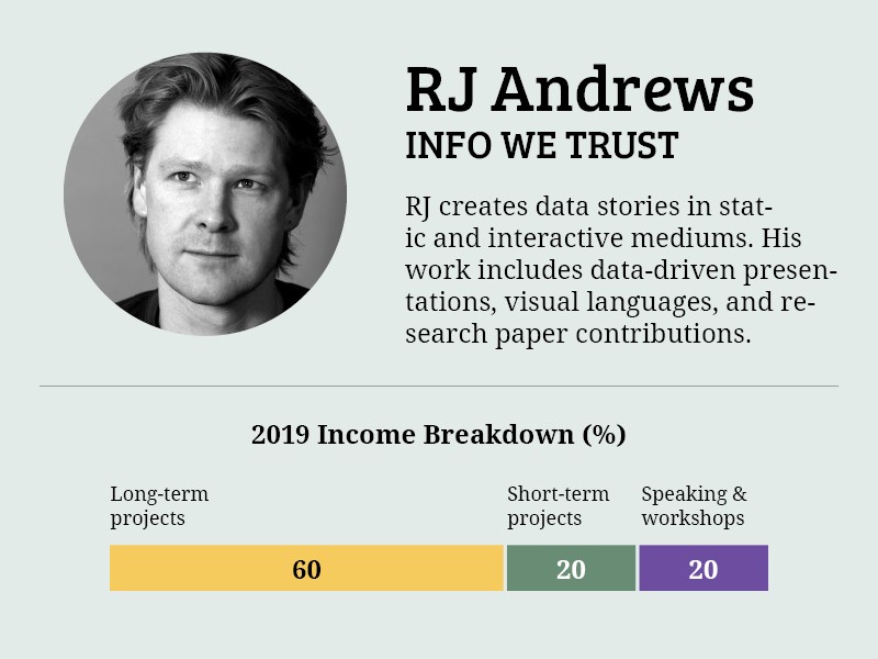 RJ is the founder and Data Storyteller at Info We Trust. He got his start by doing freelance graphic design work. The work had a heavy emphasis on design and marketing. The start of Info We Trust was when RJ’s friend asked him to work on an ambitious data story project. He thought it would be a good idea if he published this work online and that was when he built his website for Info We Trust. In 2014, he made Creative Routines which helped his website gain a lot of interest.