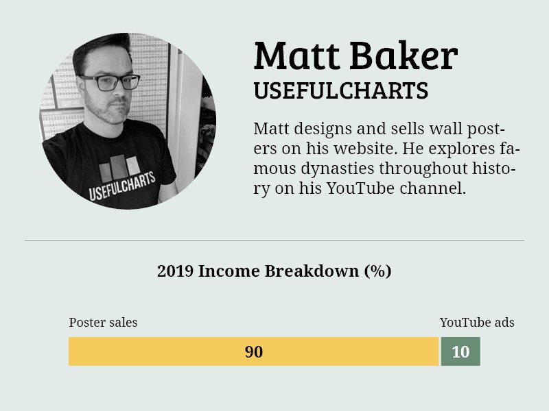 Matt is the founder and designer at UsefulCharts. Matt spent almost a decade teaching English in Sri Lanka. After returning to Canada and getting a divorce in 2009, Matt found himself unemployed and needing a way to make money while raising his young family. He made a website and put up ads through Google Adsense. This allowed him to work from home while raising his children. He realized he needed a more sustainable income and started making small cheat sheets to sell online. This evolved into a business where he creates and sells large history posters. He initially sold exclusively on Amazon to get traffic for his business. In 2018, he shifted his online shop away from Amazon to his website with Shopify. This allowed him more control of his business and customer base. For each poster he sells, he earns 40% of that in net profit. He also makes ad revenue from YouTube and re-invests that into the narrator and animator he hired to create his videos.