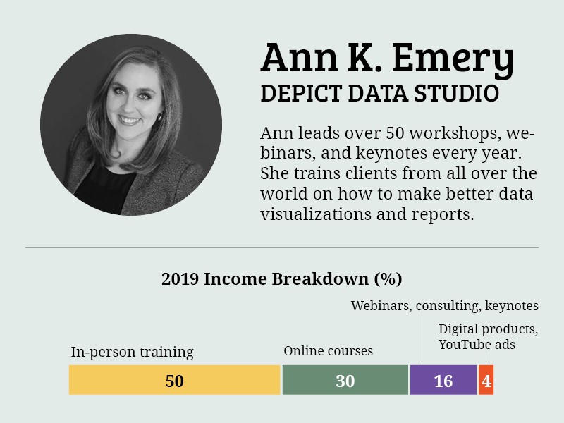 Ann called her first year in business her “dabble year.” She designed dashboards, reports, slideshows, infographics, held various types of training and offered broad consulting services. She noted that this process could take several months or several years.