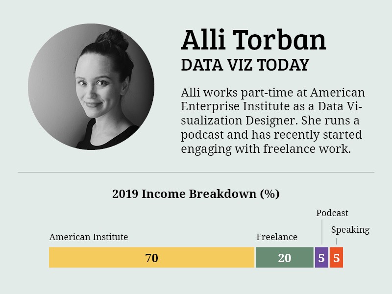 Alli is the host of Data Viz Today podcast. Before Alli transitioned into data visualization, she was a software tester and data analyst for government clients. She had kids several years later and stopped working. Inspired by Work PAUSE Thrive: How to Pause for Parenthood Without Killing Your Career, she thought that this would be a good opportunity to pivot into a job she liked better. During her exploration, she realized data visualization design would be a good career path for her. With no background in data visualization or design, she thought the best way to build her skills and knowledge was to start a podcast. Her podcast focused on the craft of data visualization design. She interviews designers to understand how they build their pieces and she designs something using their process.