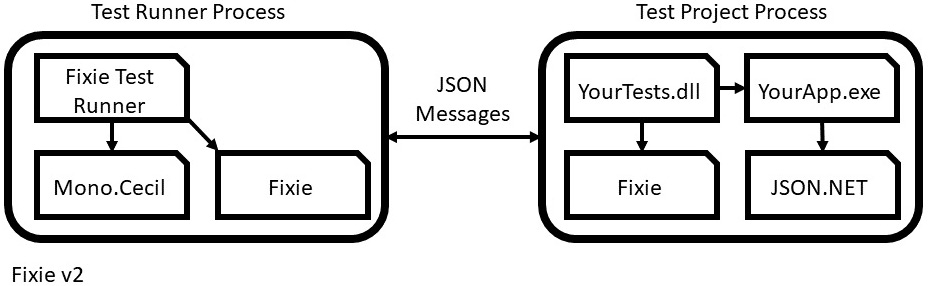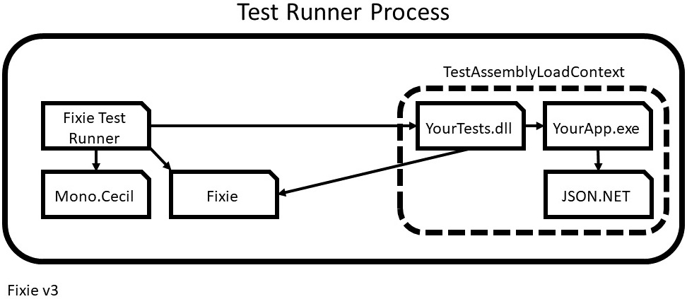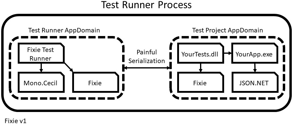 fixie-design-diagram-v1-cropped.jpg The Test Explorer plugin and its own dependencies (like Mono.Cecil) live in one AppDomain. The test assembly and its dependencies live in a second AppDomain. A painful serialization boundary allows requests to cross the chasm with no risk of mixing the loaded assemblies.