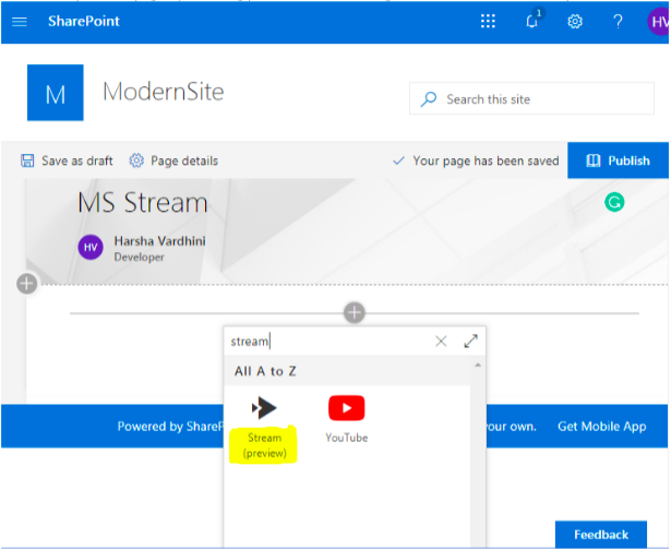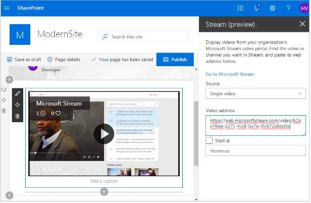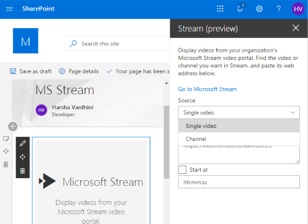 3. Save and publish the Page. Your video is added in the SharePoint page.