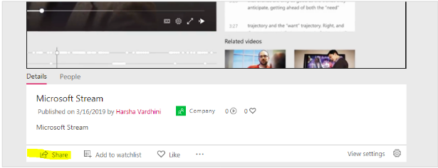 2. Select the Share button from either the video page or when finding videos through search or