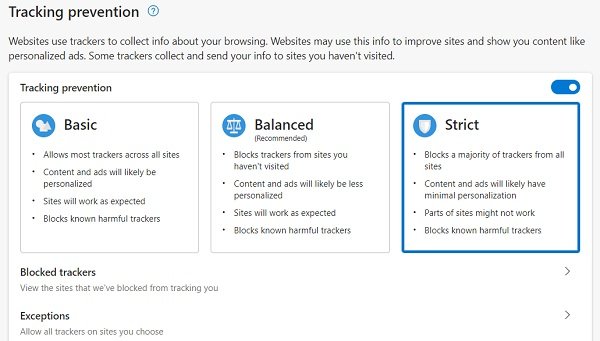 Now, mostly the tracking prevention settings in other web browsers are pretty simple but in Microsoft Edge, it is specially designed with different privacy trackers. It provides three different levels of prevention and you can select the one which suits you the best. The three tracking prevention levels in Microsoft Edge are –